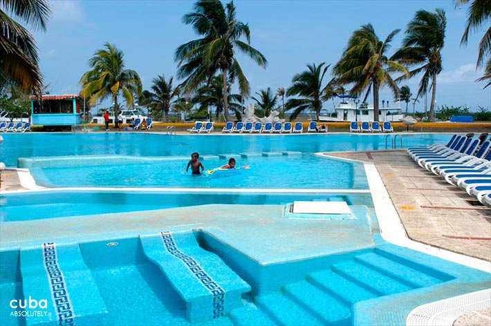 The Acuario recently merged afresh from refurbishment after serving for several years as a quasi-medical facility during Cuba’s Operación Milagro. Its main appeal is the fabulous and vast swimming pool with poolside bar and café favored by foreign boaters, who lend a party atmosphere. The main structure – a perfect example of quirky post-modernist Cuban architecture – has a huge sunlit lobby, a buffet restaurant, plus bar and games room. An adjoining complex features boutiques, a pharmacy, and beauty parlor.