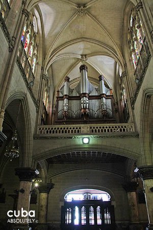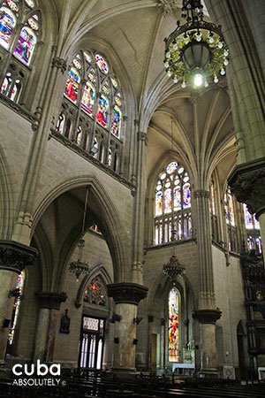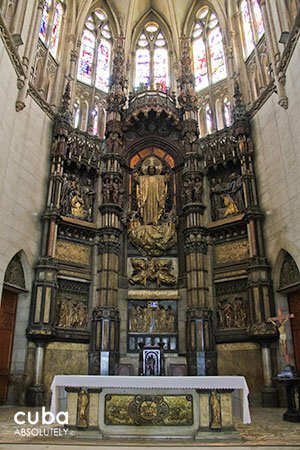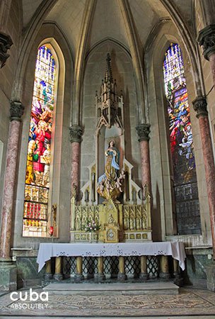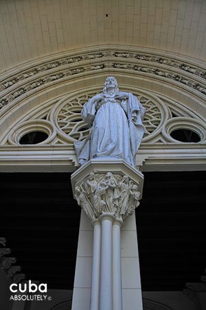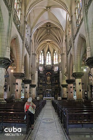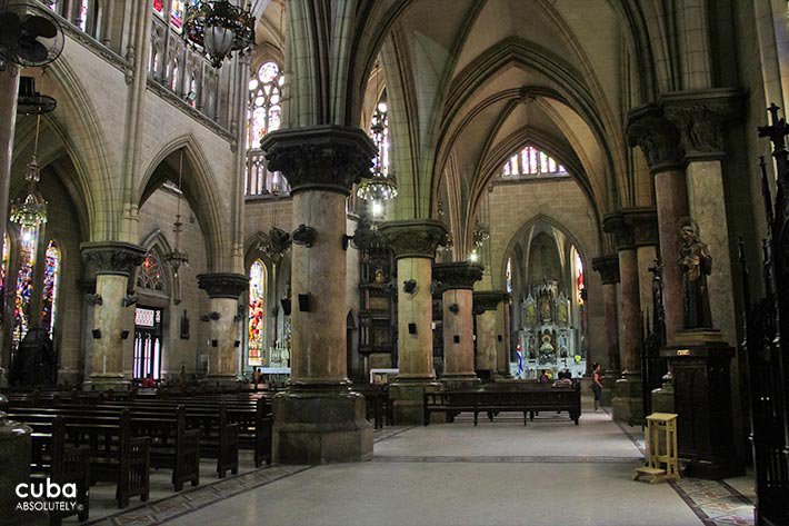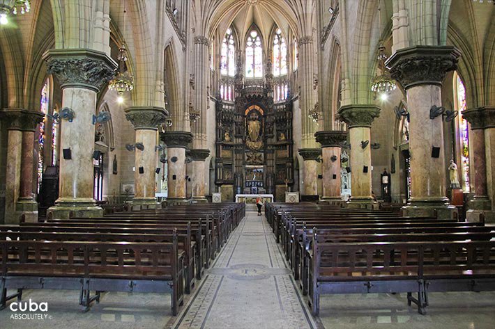 This church has three naves and three doors. The floor of the central nave consists of stone and glass tiles, and has the Greek letters alpha and omega engraved on it by the entrance. From the street (Reina), you can see the image of the Sacred Heart carved in wood and a group of five angels with their wings spread to form a baldachin. By the altar, there is a bronze plaque where Jesus is portrayed as a slaughtered lamb. The two lateral naves form a Latin cross, where there is also an image of the Virgen de la Caridad del Cobre, patron saint of Cuba. In addition, the parish has one of Cuba’s fanciest organs. Several distinguished architects have praised this church’s façade, but have also criticized its location and interior.