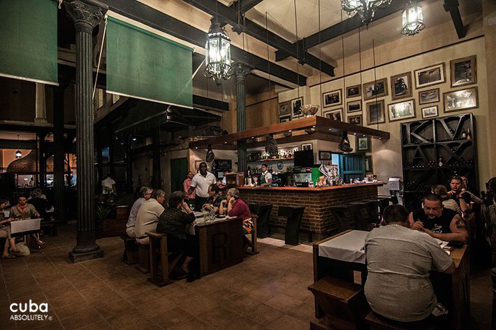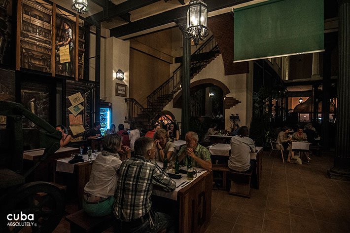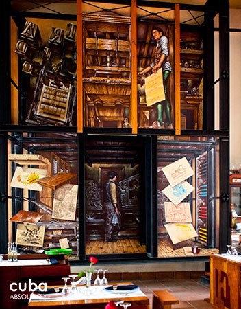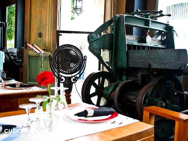 • La Imprenta is a beautiful place restored on top of the ruins of what used to be La Habanera printing house back in the 19th century. This is a place of homage to Gutenberg’s printing. More to the point, this is our favourite state-run (Habagaunex) restaurant in Old Havana. This is where real quality restoration has been combined with thoughtful design as to what works well for a restaurant. The effect is fabulous. The space is huge but has been designed in such as way as to give more intimacy and space. There is a mix of contemporary metal murals, designed from typographical motifs by Espacio Cubano (Cuban Space) group, wooden tables and seats recreated with letters and numbers, additional furniture inspired by desks or with symbolic references to printing type cases and even courtyard well, to which visitors can access through a wooden footbridge. Indoor and outdoor areas make up the structure of this place which has a room called Salón Boloña on the upper floor, named after the first Cuban printer, José Severino Boloña. The kitchen, which is at the end of the ground floor, has a traditional chimney with an oven made of firebricks.