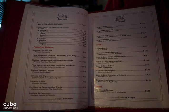 The menu is one of those books where it is almost easier to ask what they don’t serve. 10 types of fish and shrimps, 4 styles of lobster, pizza and pasta. Steaks and pork. Given that prices are very reasonable (CUC 4-6 for a main course and only CUC 13 for the lobster), you should not expect gourmet cuisine but on the other hand everything, which we ate, was decent, well cooked and nicely accompanied (if a little unimaginative).